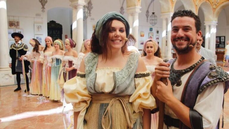Caballos, tronos, banda de músicos, túnicas cortesanas, trajes de la comedia italiana del siglo XIX, en definitiva vestuarios de distintas épocas y muchos detalles. Comerciantes, carpinteros, agricultores, administrativas, madres, hijas, amas de casa, funcionarios y hasta el alcalde. El pueblo de Hinojosa a escena. Fiestón teatral. Con una poderosa fuerza escénica visual y sonora. La Vaquera volvió y con ella sus parlamentos amorosos y filosóficos, sus bailes, proyecciones, las canciones, la música en directo… El buen hacer del director hizo que lo nuevo brotara entre la esencia. Afinadísima la dirección de principio a fin.