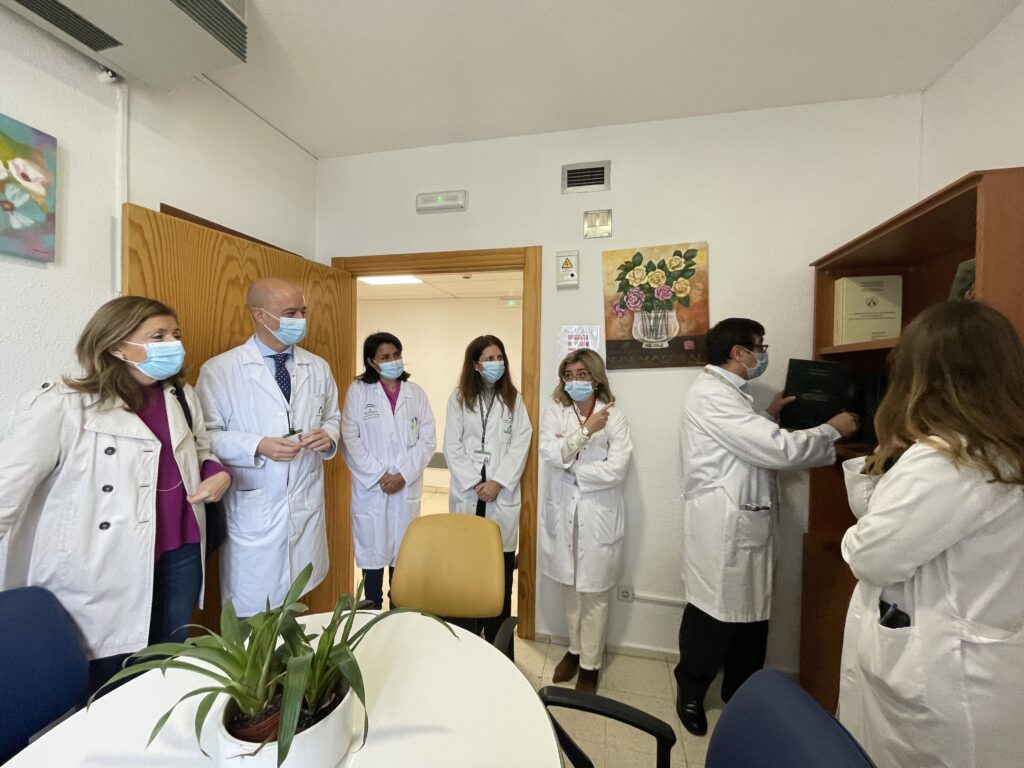 La delegada de Salud y Consumo, María Jesús Botella, acompañada por el di-rector gerente del complejo sanitario, Francisco Triviño, otros integrantes del equipo directivo y responsables de Oncología Médica, han visitado esta mañana la sala acondicionada para hacer más llevadero el acompañamiento de familia-res y cuidadores.