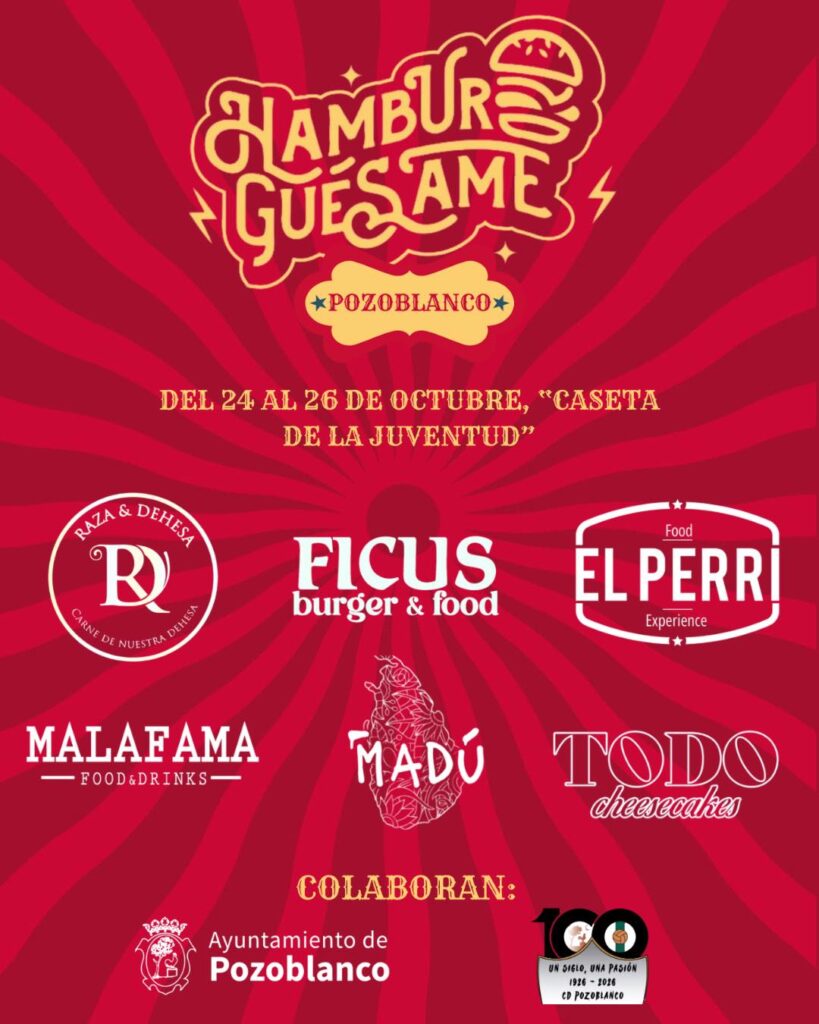 Pozoblanco se prepara para vivir una experiencia gastronómica única con la llegada de “Hamburguésame”, un evento que se celebrará del viernes 24 al domingo 26 de octubre en la Caseta de la Juventud, y que combinará gastronomía, música y ocio en un formato novedoso en toda la zona norte de Córdoba. La cita, organizada por el Club Deportivo Pozoblanco con motivo de su centenario y en colaboración con el Ayuntamiento de Pozoblanco, contará con la participación de seis food trucks y establecimientos especializados en hamburguesas, que ofrecerán diferentes tipos de hamburguesas gourmet y postres artesanales. Entre los participantes se encuentran Raza y Dehesa, Ficus, El Perri, Madú y TodoCheeseCake, establecimientos de la provincia de Córdoba, así como Malafama, empresa local participante.